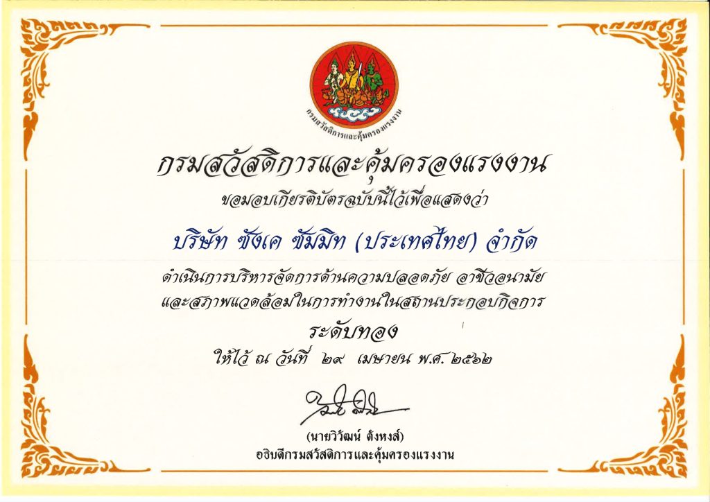 2019 04 : Achieved in Gold-level of Meets the requirement of the Occupational Safety and Health Management Standard in Workplace from the Department of Welfare