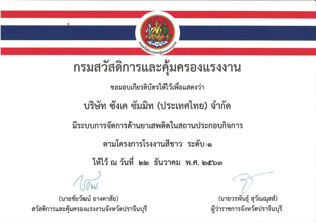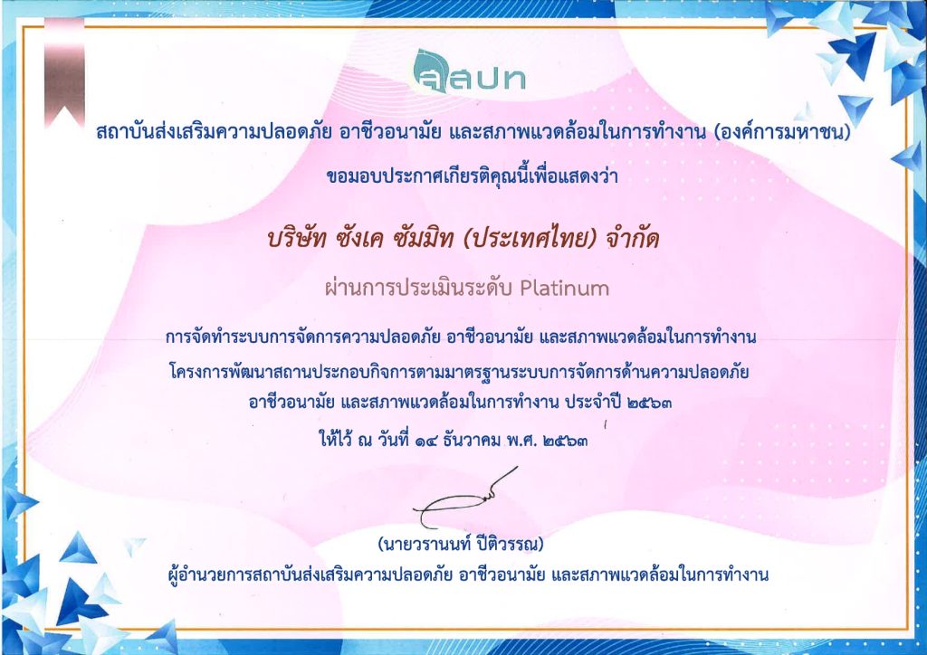 2020 12 : Achieved Platinum-level of Meets the requirement of the Occupational Safety and Health Management Standard in Workplace from Thailand Institute of Occupational Safety and Health